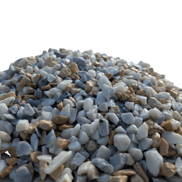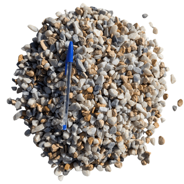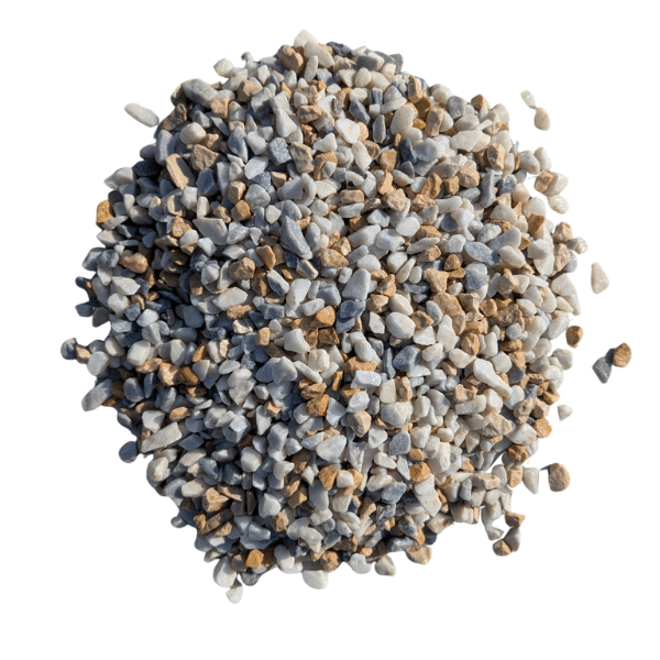 Il appartient à la famille des granulats décoratifs haut de gamme. Sa palette chromatique unique mêle des nuances de rose, beige, gris, ocre et crème. Ces tons proviennent directement de la roche naturelle concassée, garantissant leur authenticité et leur durabilité.